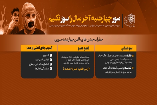 عضو هیئت علمی دانشگاه علوم پزشکی شهید بهشتی ضمن بیان خطراتی که در برخی مراسم های چهارشنبه سوری جان مردم را تهدید می کند، درباره اقدامات اولیه برای کنترل وضعیت افراد آسیب دیده در این جشن ها نکاتی را ارایه داد.