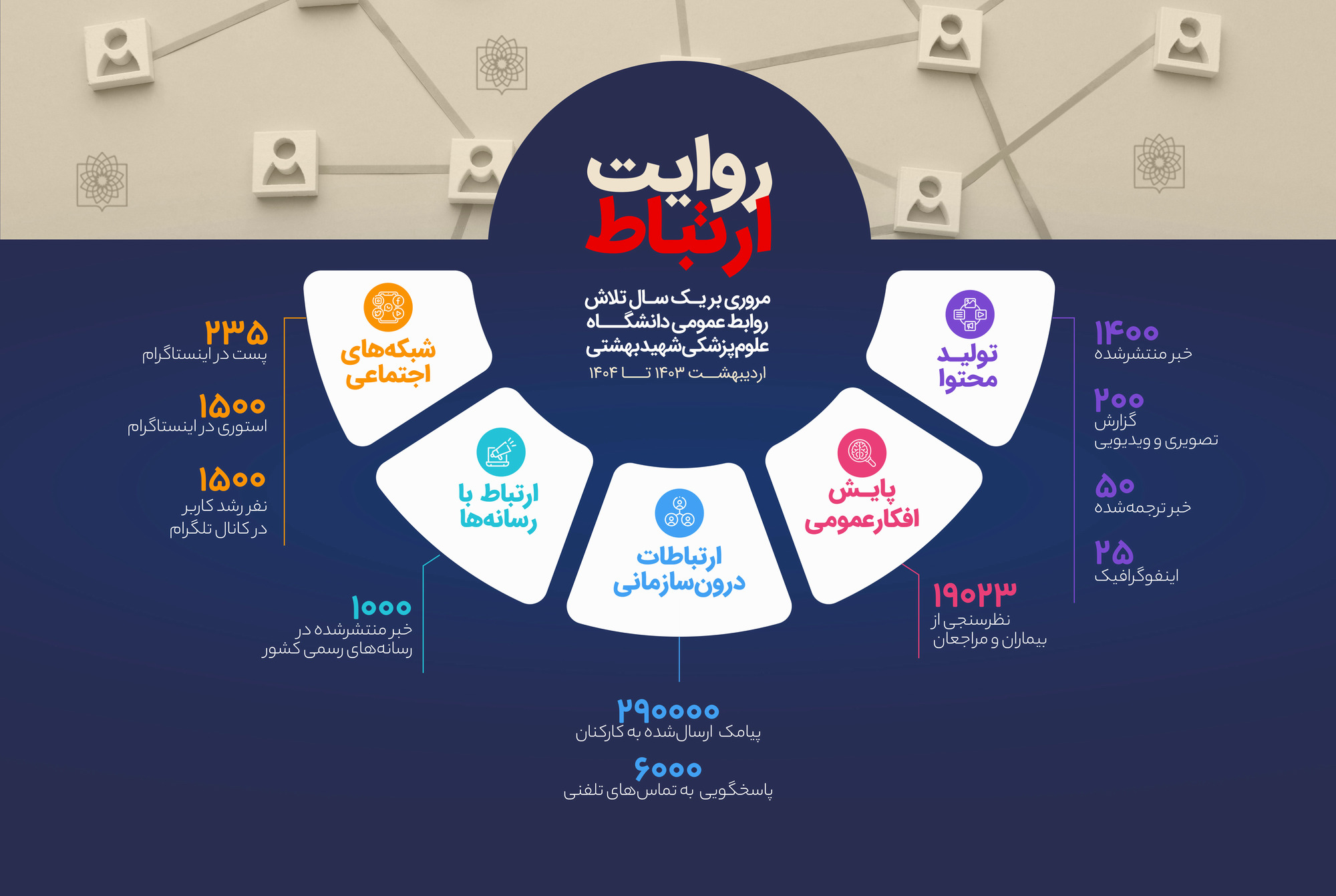 روابط عمومی دانشگاه علوم پزشکی شهید بهشتی در فاصله اردیبهشت 1403 تا 1404 با رویکردی فعال، شفاف و پاسخگو تلاش کرد پل ارتباطی موثری میان دانشگاه، کارکنان، رسانهها و افکار عمومی بسازد. به مناسبت فرا رسیدن 27 اردیبهشت ماه و روز ارتباطات و روابط عمومی، گوشهای از این مسیر را در قالب اینفوگرافیک به تصویر کشیدیم.