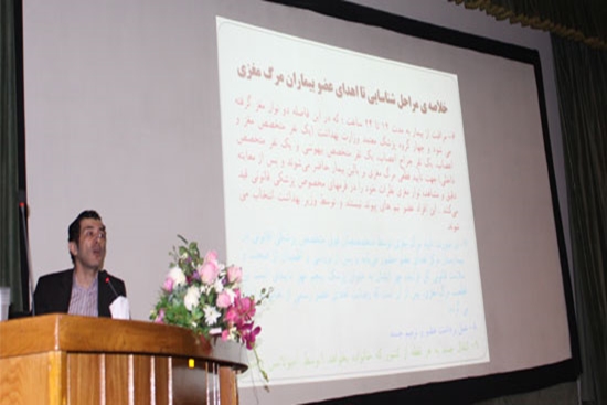 در کارگاه مذکور دکتر مسعود مظاهری ضمن تبیین تاریخچه و مفهوم مرگ مغزی به تدریس مباحث مربوط به مرگ مغزی و اهدای عضو پرداخت که تشخیص مرگ مغزی، معاینات کلینیکی در بیماران مرگ مغزی، تست های پاراکلینکی در بیماران مرگ مغزی، ارزیابی اهدا کنندگان مرگ مغزی، معیارهای اهدای عضو، مراقبت و نگهداری از بیمار مرگ مغزی و چگونگی برخورد با خانواده مرگ مغزی از جمله مباحث ارایه شده در این دوره آموزشی بود.