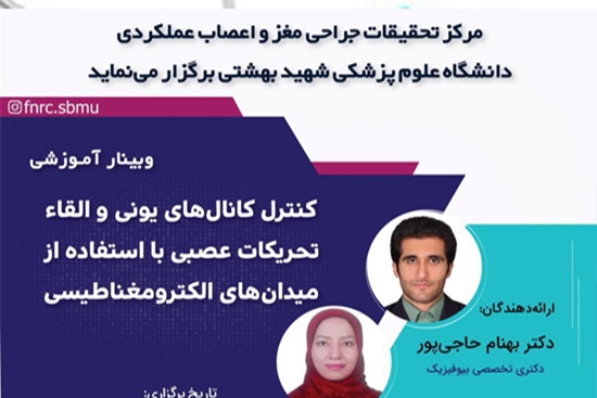 به گزارش روابط عمومی دانشگاه علوم پزشکی شهیدبهشتی، وبینار آموزشی کنترل کانال های یونی و القاء تحریکات عصبی با استفاده از میدان های الکترومغناطیسی،  23 آذرماه ساعت 10 صبح  توسط مرکز تحقیقات جراحی مغز و اعصاب عملکردی دانشگاه علوم پزشکی شهید بهشتی به صورت رایگان  برگزار می شود.