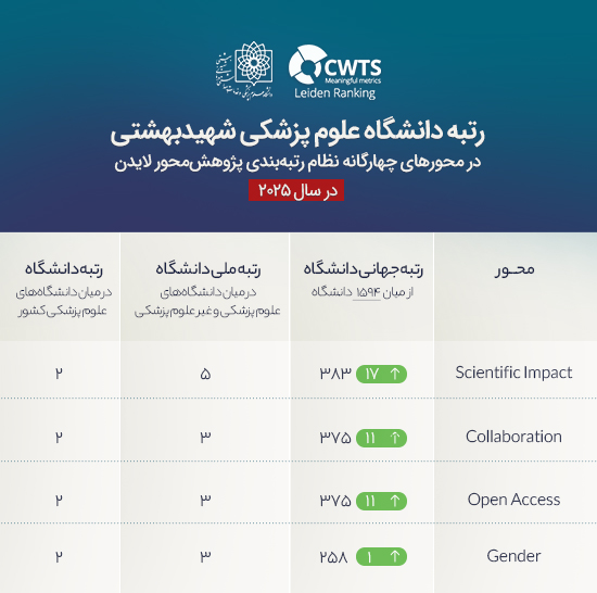 دانشگاه علوم پزشکی شهید بهشتی موفق به ارتقای جایگاه خود در آخرین نتایج نظام رتبهبندی لایدن سال 2025 شد.