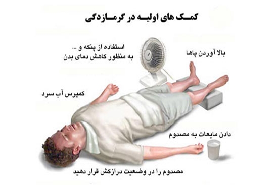 - حوله نم دار روي پيشاني و عضلات مصدوم قرار دهید ودرصورت هوشیاری می توانم صدوم را داخل وان يا لگن آب سرد قرار داد.