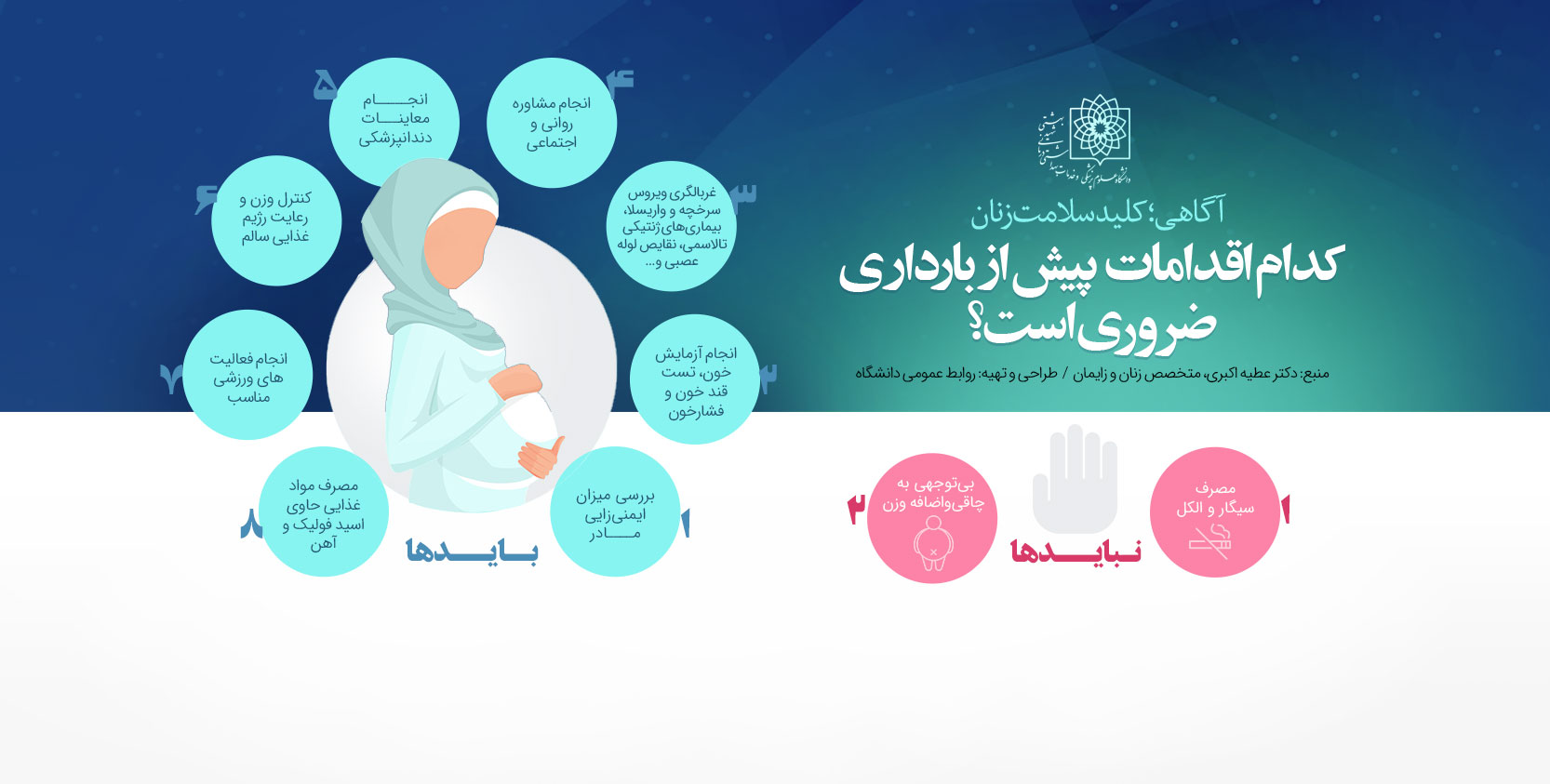 دکتر عطیه اکبری، متخصص زنان و زایمان در گفت وگو با روابط عمومی دانشگاه علوم پزشکی شهید بهشتی، هدف از نامگذاری 14 تا 28 بهمن به عنوان هفته ارتقای آگاهی درباره بارداری را افزایش آگاهی، حفظ سلامت مادر و تولد نوزادی سالم اعلام کرد و اظهار کرد: خانم ها و آقایان قبل از اقدام به بارداری باید تحت مشاوره های درمانی و غربالگری قرار گیرند تا موارد خطر از لحاظ رفتاری، اجتماعی و زیست پزشکی در این فرآیند فیزیولوژیک، شناسایی و تعدیل شود.