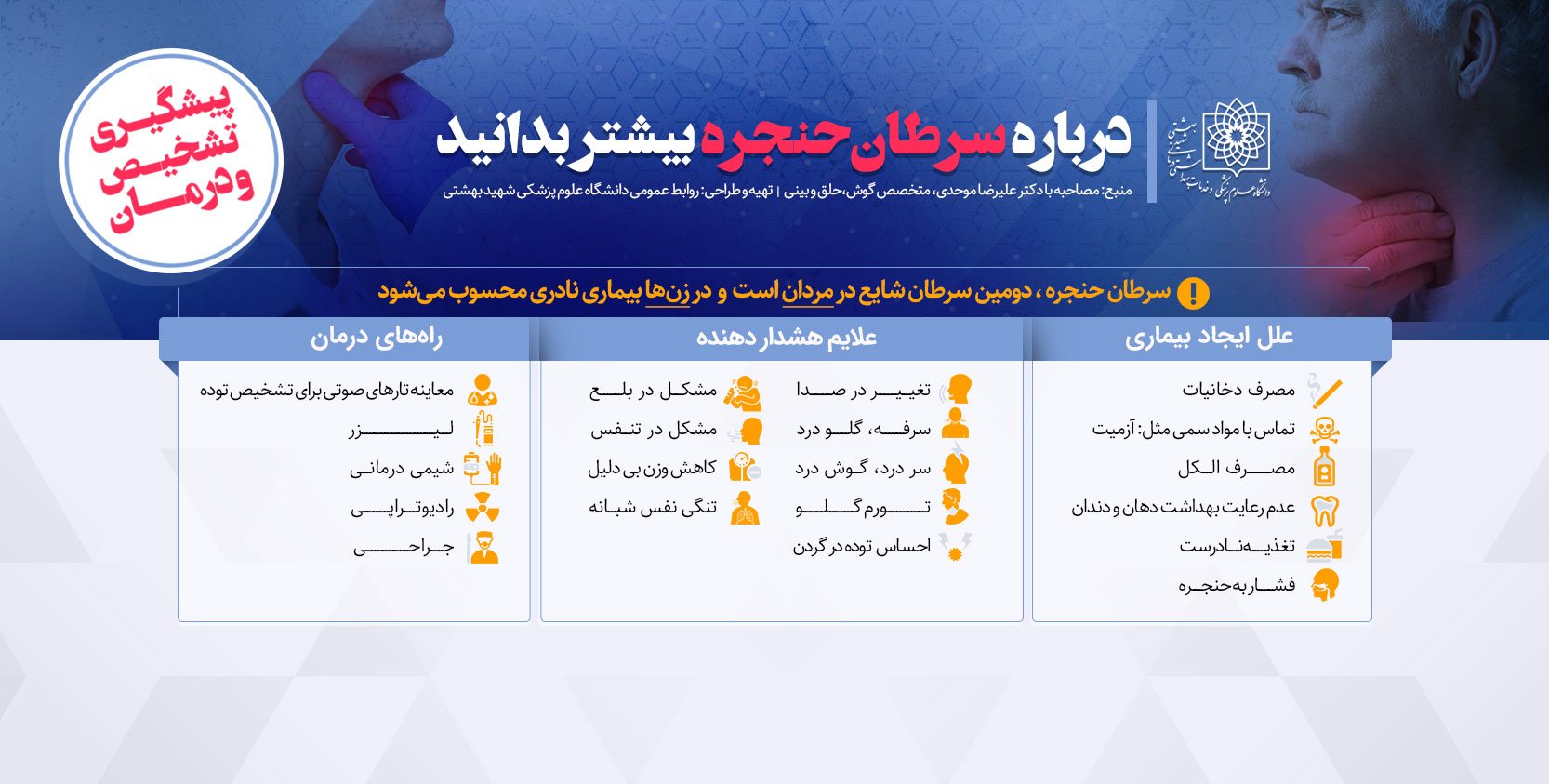 دکتر موحدی مراجعه به موقع به پزشک با علائم هشدار دهنده ابتلا به سرطان حنجره را خواستار شد و افزود: مبتلایان به سرطان حنجره باید چکاپ های دوره ای را جدی بگیرند.