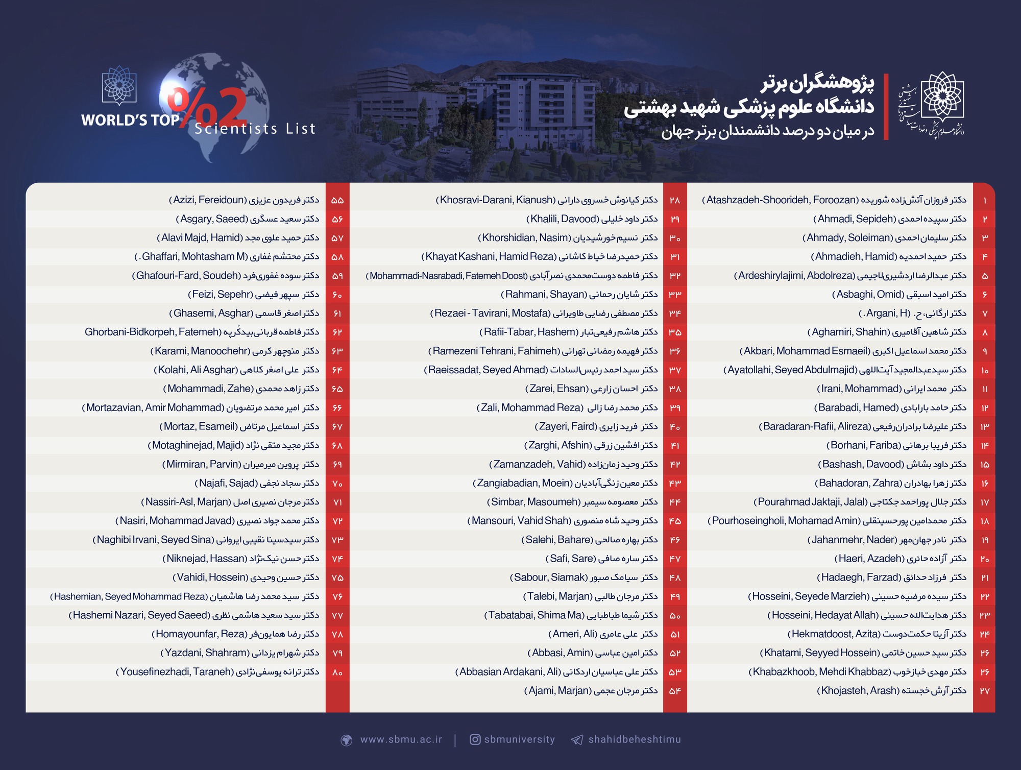 درخشش نام 80 پژوهشگر دانشگاه علوم پزشکی شهید بهشتی در میان دو درصد دانشمندان برتر جهان