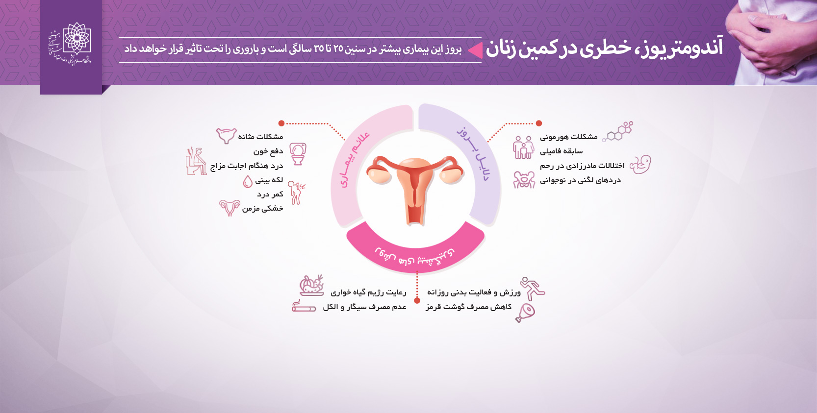 دکتر نسرین سحرخیز در گفت و گو با خبرنگار روابط عمومی دانشگاه علوم پزشکی شهید بهشتی  درباره بیماری آندومتریوز و ارتباط آن با ناباروری گفت: خون قاعدگی بافت پوشاننده حفره رحم آندرومتر گفته می شود، این بافت در هر سیکل قاعدگی ریزش پیدا می کند و زمانی که بافت آندرومتر خارج از حفره رحم باشد بیماری آندرومتریوز بروز می یابد.