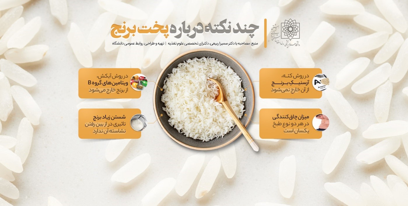 استادیار دانشکده تغذیه براساس نتایج مطالعات صورت گرفته گفت: در روش پخت برنج به صورت کته، آب در برنج  باقی مانده و آرسنیک آن خارج نمی‌شود. اما در پخت برنج به صورت آبکش، مقداری از آرسنیک آن خارج می‌شود. بنابراین از نظر بهداشتی، برنج آبکش سالم‌تر از برنج کته است.
