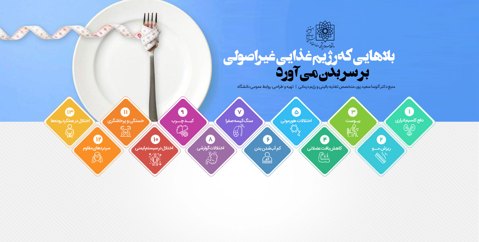 وی با اشاره به این که رژيم های غذايی نامناسب و بويژه رژيم های تک ماده ای كه در آن فقط به خوردن يک  قلم ماده غذايی توصيه می شود باعث از دست رفتن بافت های عضلانی، استخوانی و از دست رفتن آب بدن می شوند هشدار داد: بايد نسخه رژيم های درمانی و لاغری افراد توسط متخصصان حوزه تغذیه پيچيده شود تا متناسب با وضعيت فرد، نحوه سبک زندگی اصلاح شود.