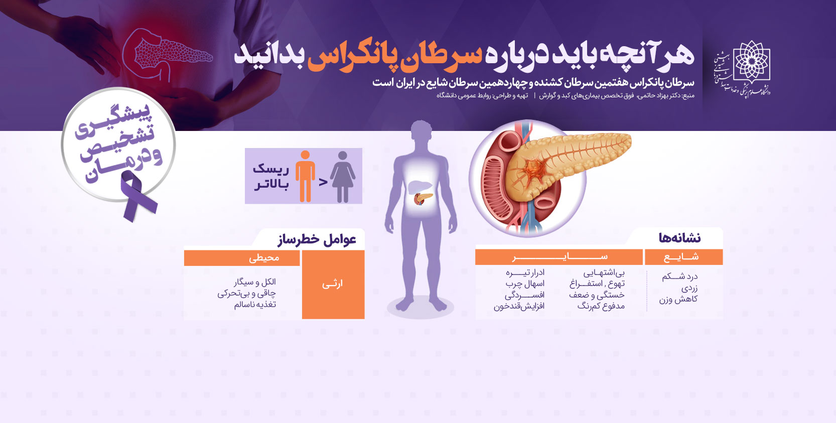 دکتر بهزاد حاتمی در گفت و گو با خبرنگار روابط عمومی دانشگاه علوم پزشکی شهیدبهشتی، با اشاره به این که لوزالمعده یک ضایعه گلابی شکل به طول 10 تا 15 سانتیمتراست که پشت معده بین معده و ستون فقرات قرار دارد، اظهار کرد: سرطان پانکرانس یکی از سرطان های شایع است که هفتمین علت مرگ ناشی از انواع سرطان ها به این بیماری تعلق دارد.