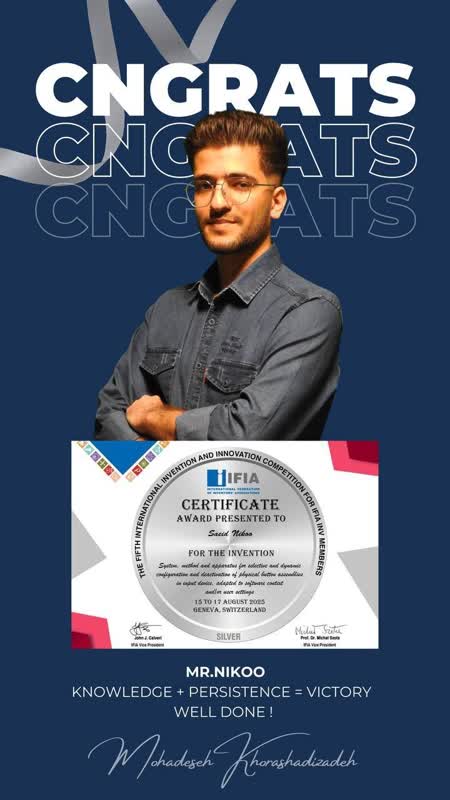 وی خاطرنشان کرد: با یاری خدا و تلاش فراوان توانستم به اختراعی با عنوان:" سیستم، روش و دستگاه برای پیکربندی و غیرفعالسازی انتخابی و پویا مجموعه دکمه‌های فیزیکی در دستگاه های ورودی، سازگار با زمینه نرم افزاری و یا تنظیمات کاربر " دست یابم که مدال نقره در مسابقات  ویژه اعضای فدراسیون بین‌المللی مخترعین در ژنو سوئیس را به خود اختصاص داد.