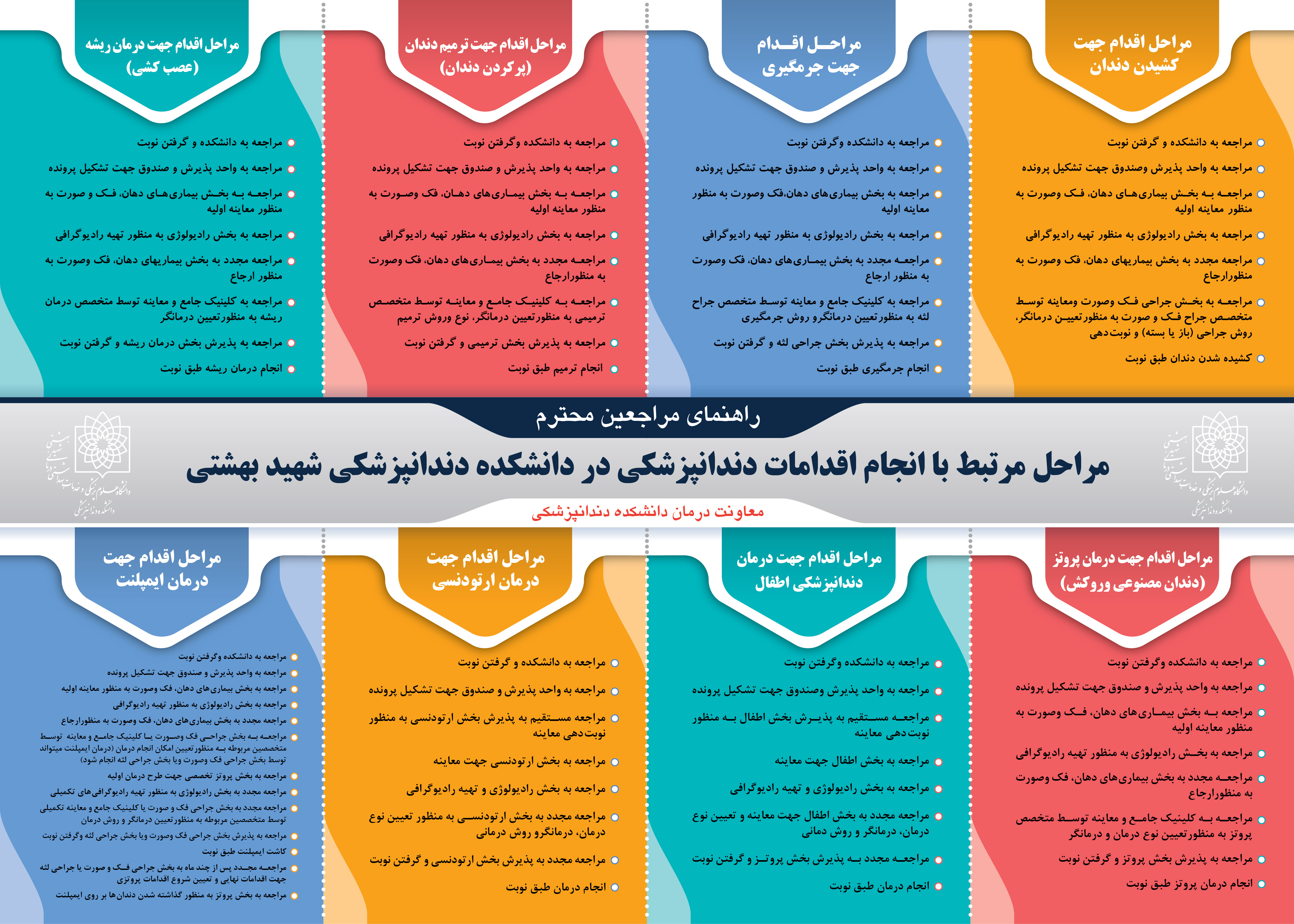 • ارجاع بیمار جهت معاینه اولیه به بخش بیماری های دهان و انجام گرافی های مربوطه در بخش رادیولوژی، سپس ارجاع مجدد به بخش بیماری‌ها برای ثبت طرح درمان