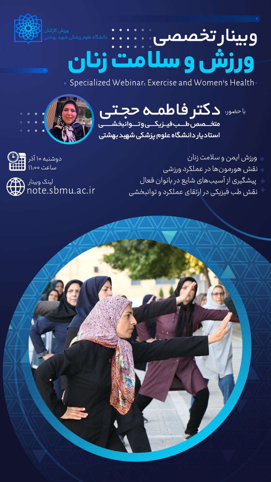 کمیته ورزش کارکنان دانشگاه علوم پزشکی شهیدبهشتی، وبینار تخصصی «ورزش و سلامت زنان» را با حضور دکتر فاطمه حجتی، متخصص طب فیزیکی و توانبخشی، روز دوشنبه ۱۰ آذر ماه ساعت ۱۱ صبح برگزار می‌کند.