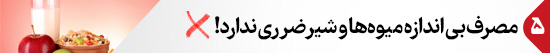 دکتر نیستانی در ادامه با اشاره به این موضوع که خوردن غذاهای کم کالری به کاهش وزن کمک می کند خاطرنشان کرد که برخی از افراد برای این‌که وزنشان را کم کنند به رژیم‌های لاغری میوه و سبزیجات رو می‌آورند و انواع میوه‌ها را در سبد غذایی‌شان قرار می‌دهند غافل از این‌که استفاده بیش از حد از میوه‌ها هم برای رژیم لاغری مناسب نیست و حتی به دلیل قند بالا باعث چاق شدن هم می‌شود.