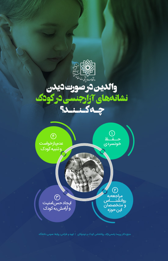 دکتر پریسا یاسمی نژاد در گفت و گو با خبرنگار دانشگاه علوم پزشکی شهیدبهشتی با اشاره به این که بیشتر کودکانی که دچار آزار جنسی شده اند نشانه های مشخصی از خود بروز می دهند، اظهار کرد: حتی اگر کودک درباره این موضوع صحبت هم نکند والدین می توانند از این نشانه ها حدس بزنند که کودکشان مورد آزار جنسی قرارگرفته است.