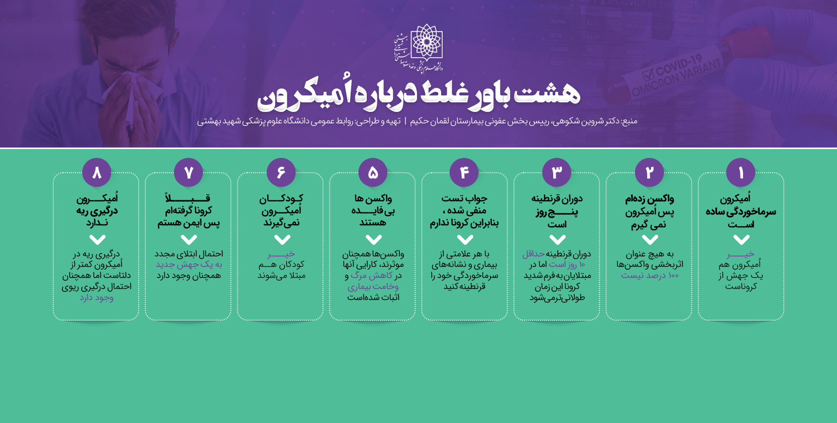 به گزارش روابط عمومی دانشگاه علوم پزشکی شهیدبهشتی، آنچه که درادامه می خوانید متدوال ترین باورهای اشتباه درباره سویه امیکرون است که باعث سهل انگاری و نادیده گرفتن شیوه نامه های بهداشتی می‌شود.